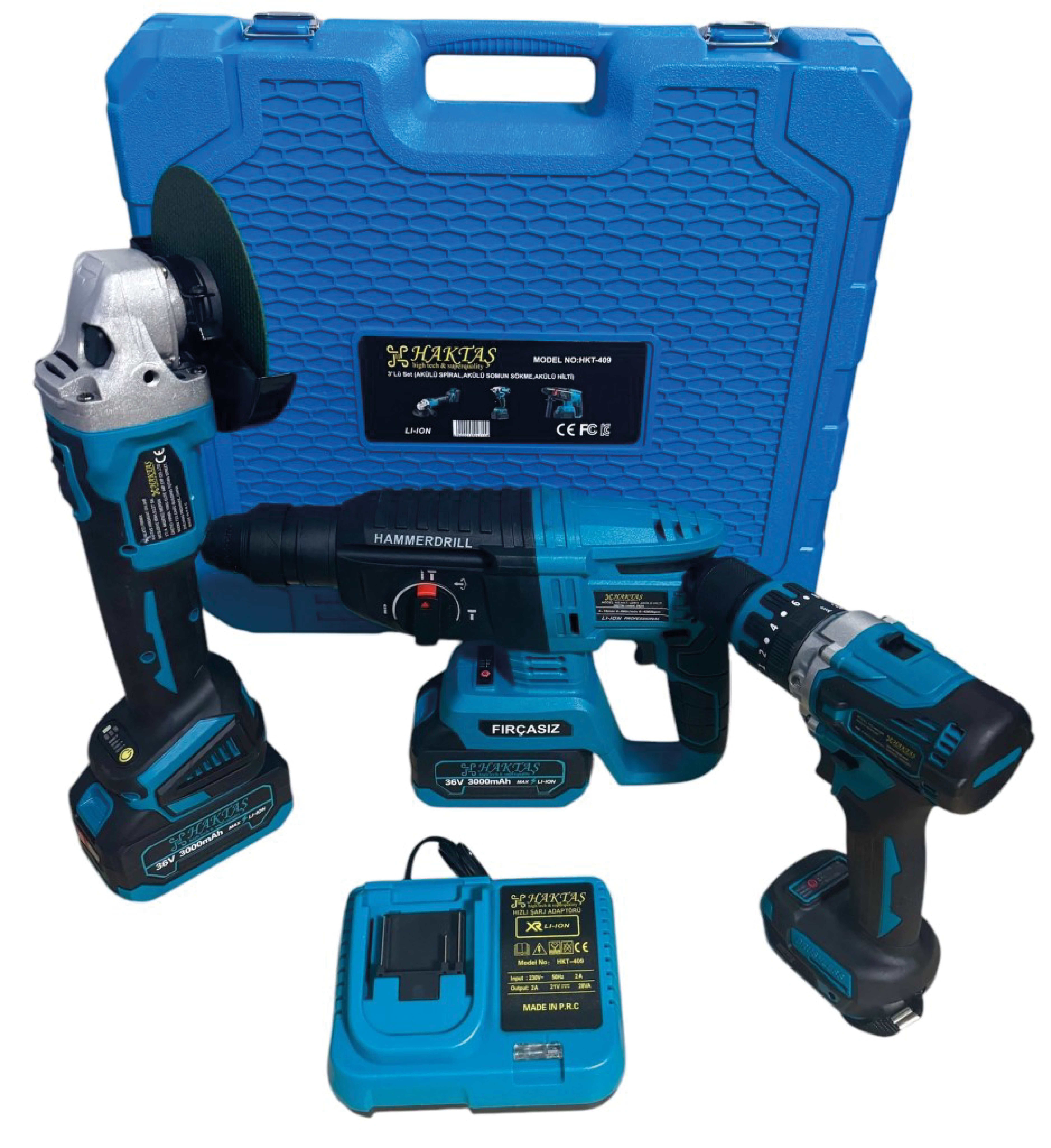 Tamamı kömürsüz motora sahip 125mm taşlama, 13mm matkap ve 26mm kırıcı delici içeren, çift akülü profesyonel avantaj seti.